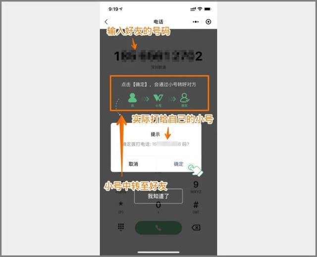 打电话、发短信需要在 “微小号” 小程序进行,不是很方便,它的工作模式有点特别:无论是打电话还是发短信,都是用自己的主号联系自己的小号,小号在后台中转至好友,对方看到的是自己小号的号码。