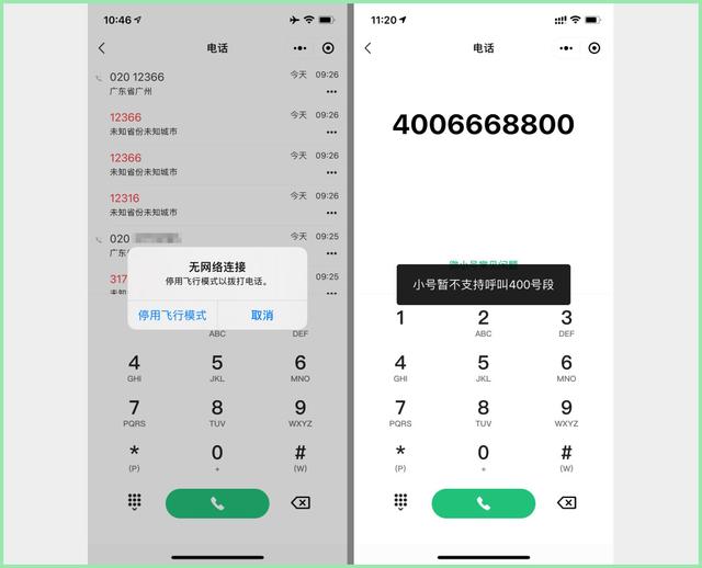 微小号不能拨打以 400、800、00 开头的号码。比如打给苹果的客服电话,会提示无法拨打,见上图。