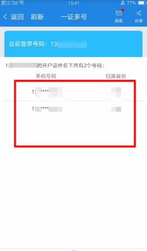 5、在这个“一证多号”的页面,我们就可以查看到一个身份名下的所有手机号了。如下图所示。