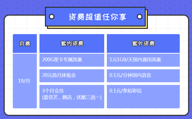 广西电信推出的星卡套餐,就是一款高度融合互联网元素的手机套餐,月租仅需19元,包含200GB星卡专属流量,可用于百度系、网易系、头条系等旗下多款应用,套餐外流量采用1元1GB/天的标准收费。用户还可以任选爱奇艺、腾讯、优酷其中之一三个月会员体验时间,首月还将获得20元体验金,降低了用户办理门槛。手机选号 合肥手机选号 芜湖手机选号