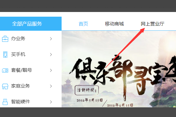 2、点击杭州后网页跳转到移动对应省份的网页中,在新的页面里,看到上方菜单栏有个【网上营业厅】。