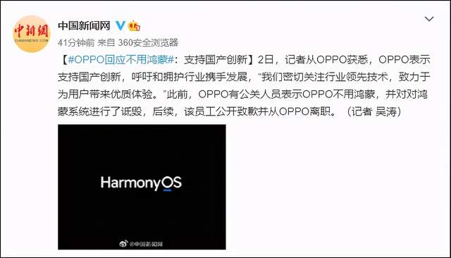此前,OPPO有公关人员表示OPPO不用鸿蒙,并对鸿蒙系统进行了诋毁,后续,该员工公开致歉并从OPPO离职。