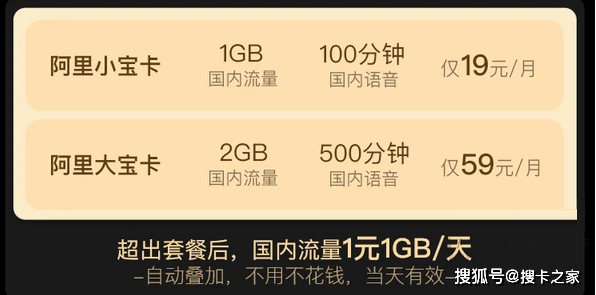 比如:阿里小宝卡月租19元=国内1G+定向30GB+接听免费;