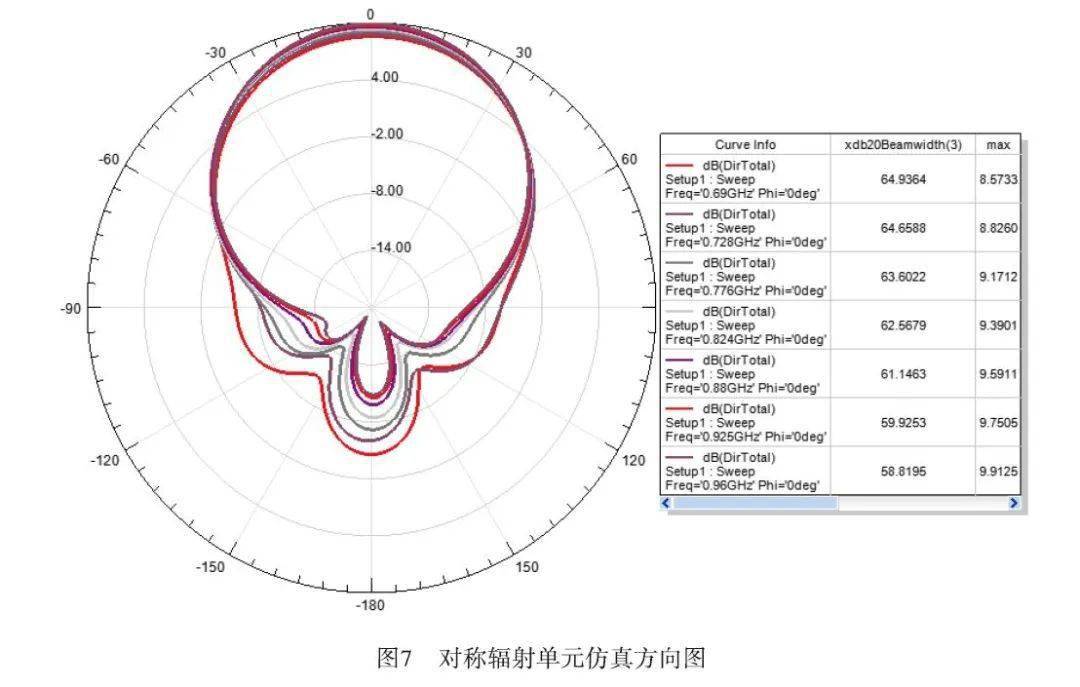 为了进一步验证验证不对称辐射单元与传统完全对称辐射单元性能是否相当,将图3和图6两个模型分别都设置在300×300×45 mm,厚度为1.5 mm的反射板上,仿真低频(690—960 MHz)方向图。对称辐射单元仿真方向图 如图7所示,不对称辐射单元方向 图8所示。直观对比图7和图8,方向图波形几乎看不出差异。