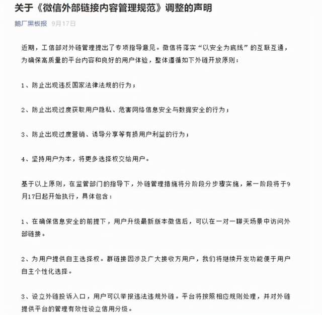 据了解,上述声明为微信在“互联互通”背景下对外链规范的进一步升级。9月17日,微信曾发布《关于〈微信外部链接内容管理规范〉调整的声明》,开放了一对一聊天场景中访问外部链接,同时为用户提供自主选择功能,设立外链投诉入口。