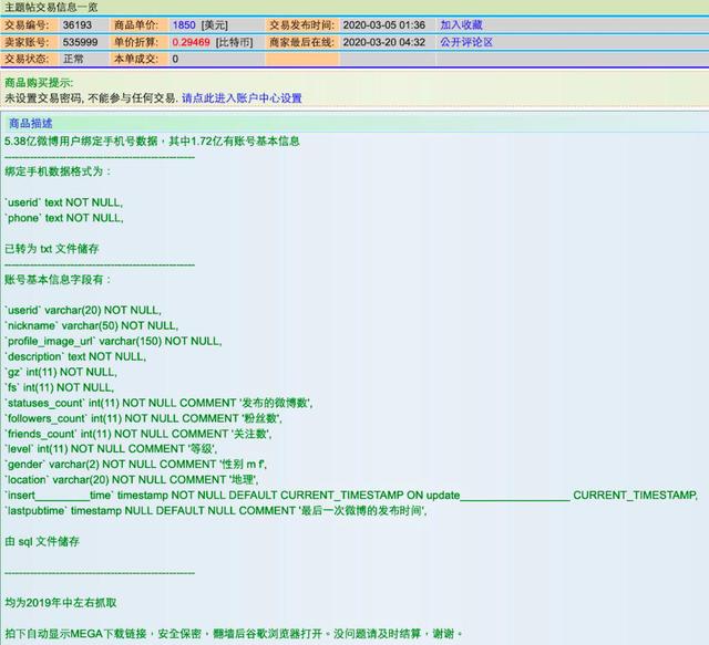 数据来自中文暗网的交易市场。有人 3 月 5 日发帖销售 5.38 亿微博用户数据,称包括用户 ID 和用户所绑定手机号。除此之外,其中 1.72 亿有账号基本信息。基本信息包括:用户名、关注数、地理位置、最后一次微博发布时间等微博公开信息。发布者称数据为 2019 年年中获得。