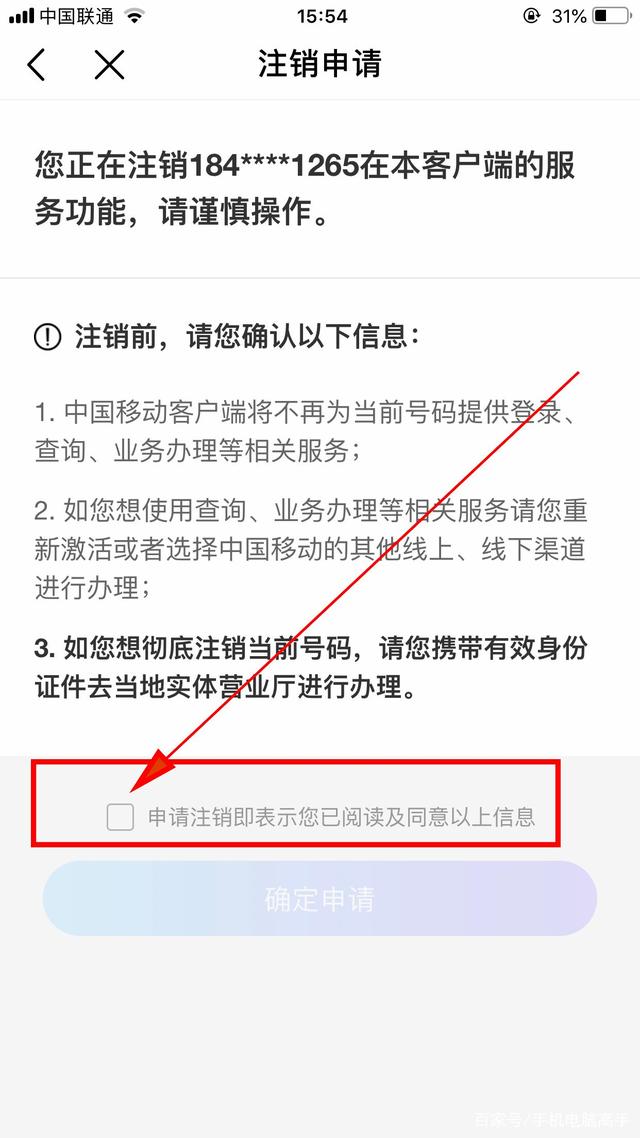 第六步:选择“注销服务”以后,会弹出一个“注销申请”的页面,勾选申请注销选择框以后,我们就已经提交了注销申请,这时候我们只需要携带身份证就可以到营业厅办理手机卡注销了,我们不需要在营业厅签字等待了,非常方便。