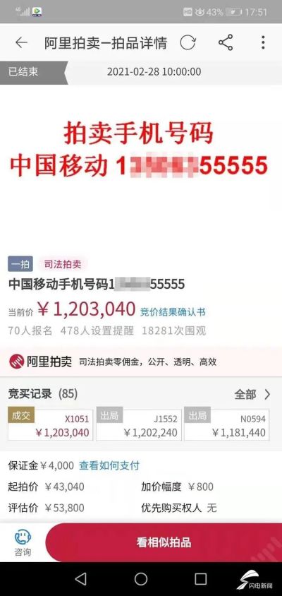 冠县人民法院执行局法官赵天鹏称,我们按照程序对手机号进行了委托评估,委托评估价格是53800元。我们依法在拍卖平台发布公告,对这个手机号进行拍卖。发布公告以后,参与围观的人数达到了1.8万人,有70人参与竞拍,从4.3万元起拍,在开拍一个小时以后,这个手机号的价格就达到了87万。拍卖当天,经过85轮的竞价加价,这个手机号码最终以1203040元的价格成交,超出评估价的22倍。