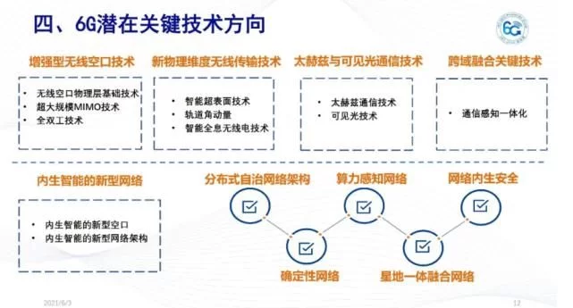 为满足上述业务应用,白皮书也提出了6G十大潜在关键技术方向,包括内生智能的新空口和新型网络架构,增强型无线空口技术、新物理维度无线传输技术、新型频谱使用技术、通信感知一体化技术等新型无线技术,分布式网络架构、算力感知网络、确定性网络、星地一体融合组网、网络内生安全等新型网络技术。