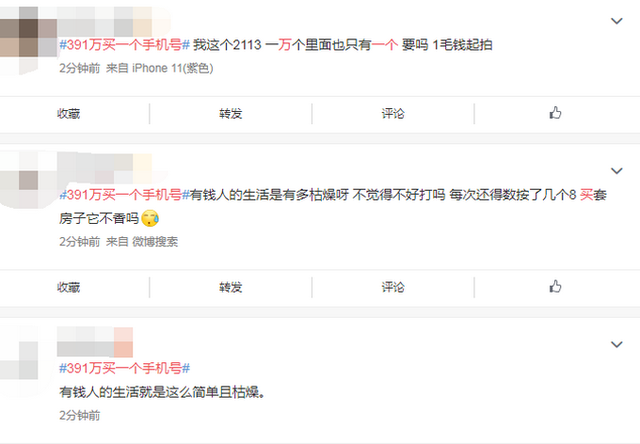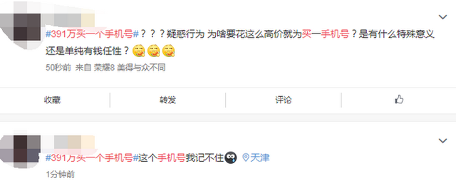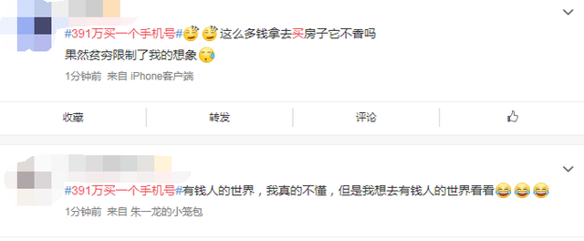 对此,网友表示:有钱人的世界,我们真的不懂, 391 万用来在三四线城市买几套房它不香吗?不过,也有网友表示存在即为合理,有这钱买手机号的人,应该也看不上三四线房产~