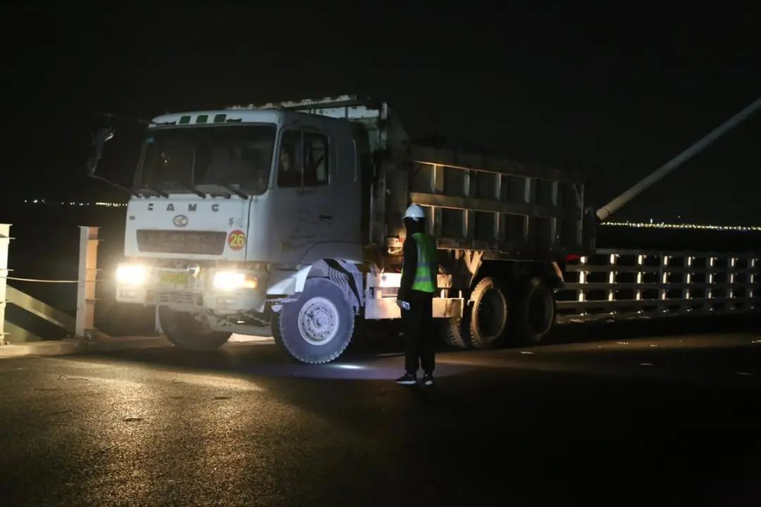 每辆重载达35吨的货车正在对大桥进行荷载测试。