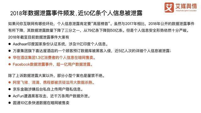 报告还指出,2018年数据泄露事件频发:Facebook数据泄露事件、华住酒店集团数据泄露事件等,近50亿条个人信息被泄露。