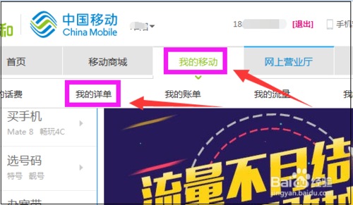 登陆后,将鼠标放到页面上面的“我的移动”,然后在弹出菜单中点击“我的详单”。