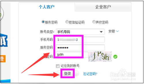 进入登录页面,输入手机号码、服务密码、验证码后,点击“登录”。